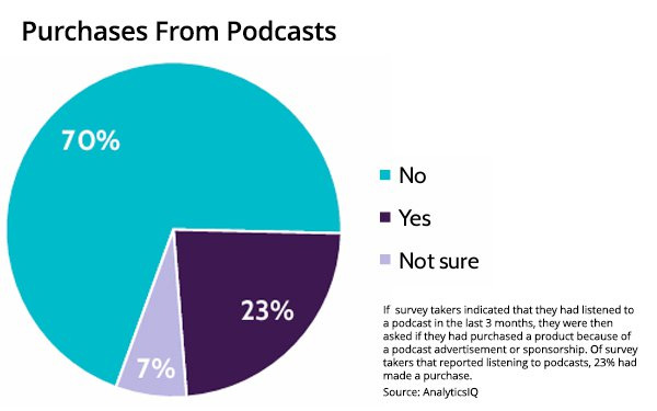 Загалом 46% слухачів подкастів повідомили, що дізналися про новий бренд або продукт, а ще 23% придбали цей продукт на основі реклами або спонсорства, за даними команди Cognitive Sciences в AnalyticsIQ.
