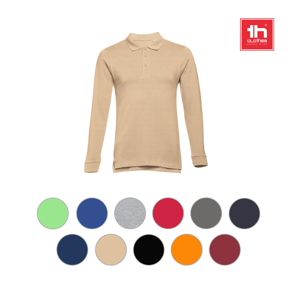 Long-sleeved polo for men in piqu? 100% carded cotton (210 g/m²) (colour 183: 85% cotton/15% viscose). Regular cut polo with rib collar and cuffs. The collar is reinforced with piqu? knit ribbon. Features a reinforced collar with 3 matching colour buttons (extra button inserted in the inner seam). Piece cut and sewn with side vents at the hem. Removable visible label. Size: 3XL