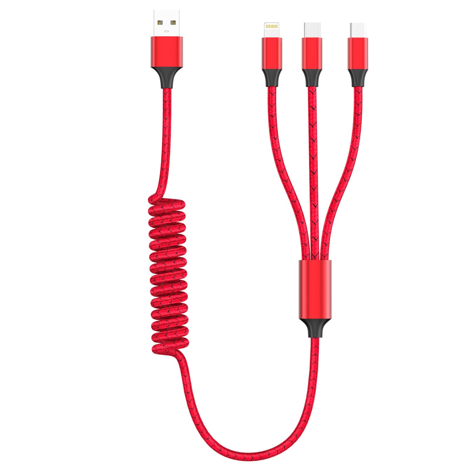 Універсальний кабель 3-в-1 для зарядки гаджетів, довжина в розтягнутому стані 1,2 м. Має стандартний USB вхід для підключення живлення та три різні виходи Lightning + Mscro USB + Type-C.