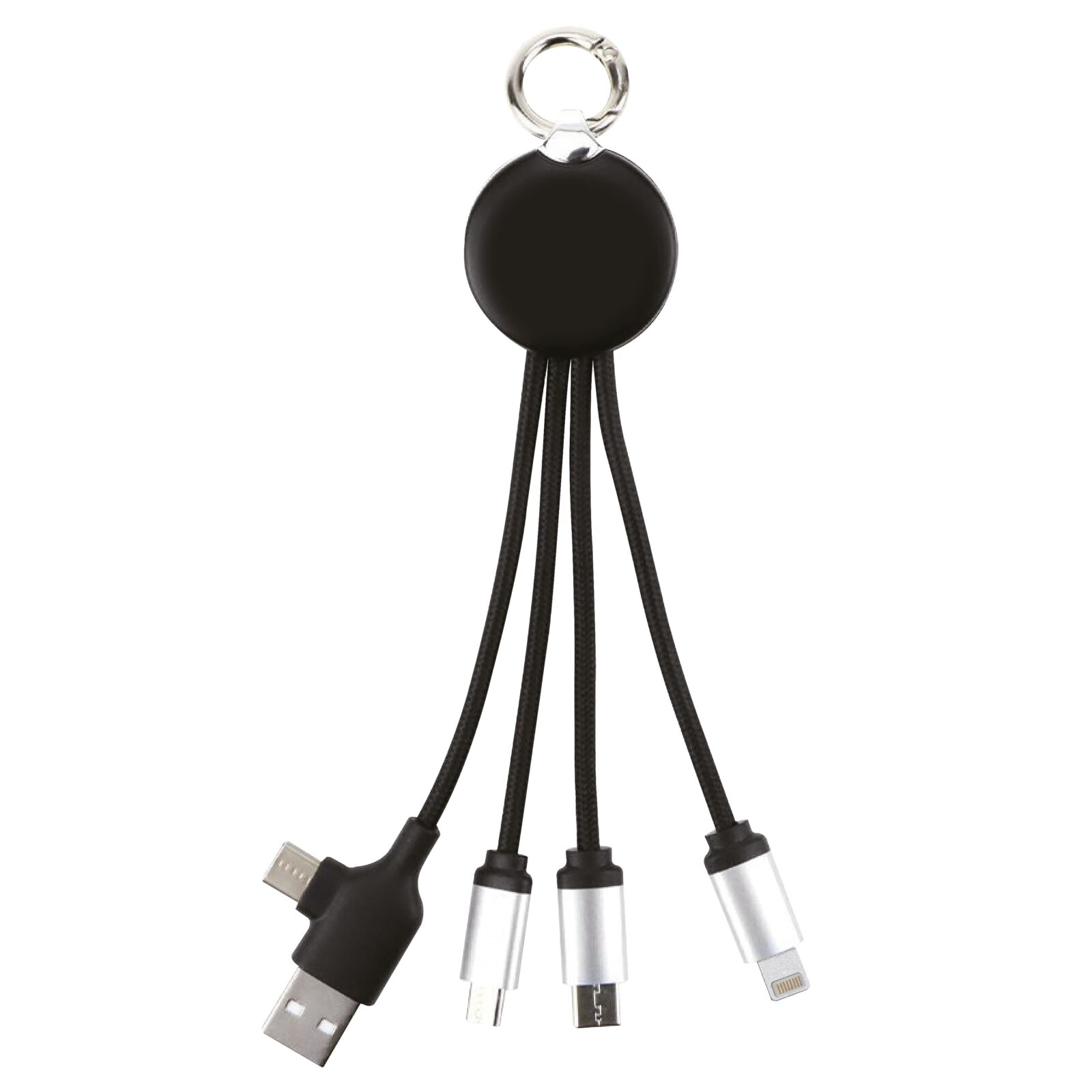 Універсальний кабель 4-в-1 для зарядки гаджетів із білою світлодіодною панеллю. Довжина 13,7 см. Має стандартний USB вхід для підключення живлення та три різні виходи 2 Micro USB, Lightning, Type-C.