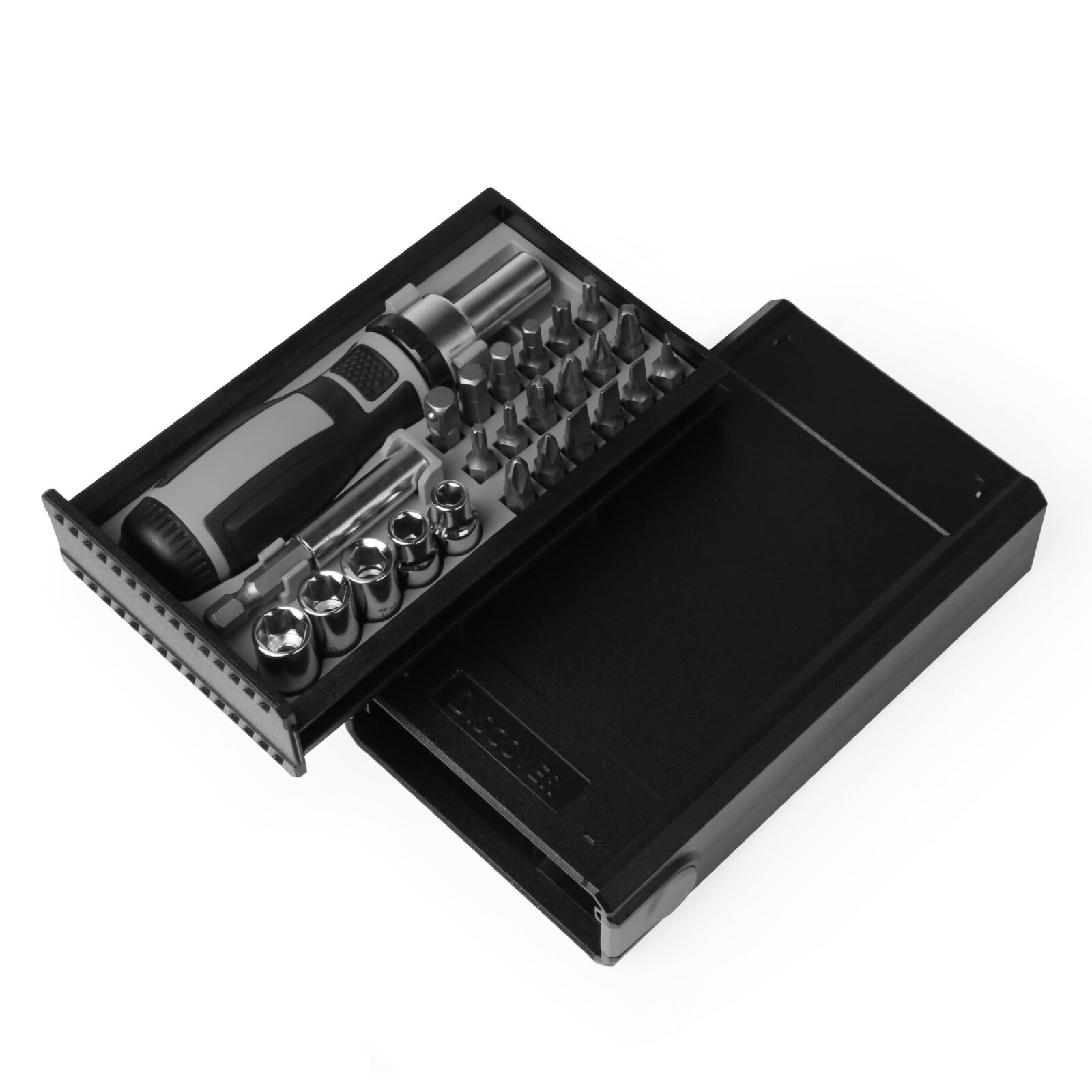 Набір з високоякісної сталі в компактній, пластиковій коробці, яка оригінально відкривається натиском на кнопку. В комплект входить 25 шт інструментів: