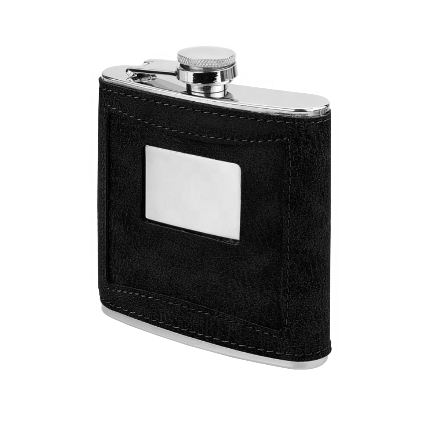 Фляга з нержавіючої сталі, з одинарною стінкою, обтягнута еко шкірою з прямокутним віконцем для нанесення.