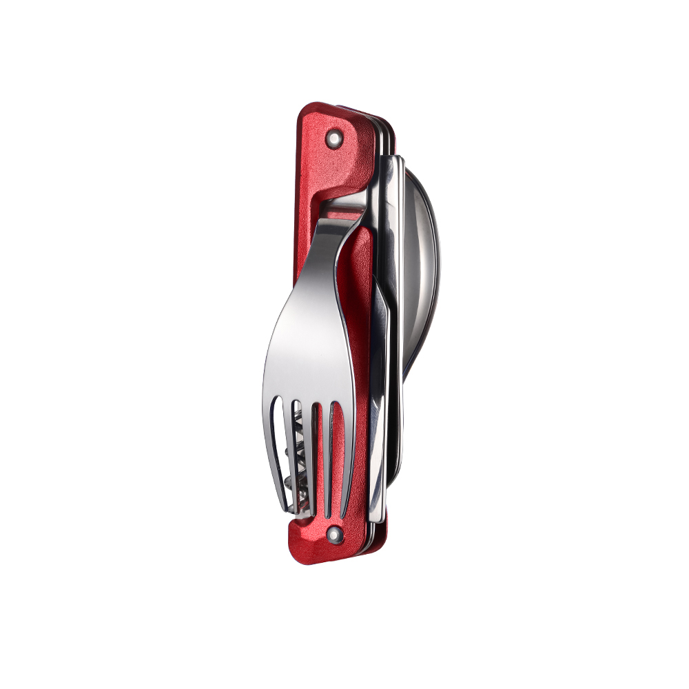 Легкий і зручний набір, виготовлений з комбінації нержавіючої сталі та алюмінію. Він ідеально підходить для кемпінгу та походів, його можна швидко і легко розділити на дві частини, щоб отримати окремі виделку та ніж з ложкою. Частини З’єднуються двома магнітними кліпсами.